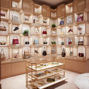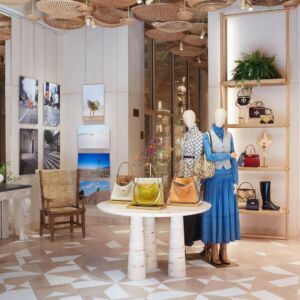 The store will feature a full range of Tory Burch products, including homeware such as pitchers and tureens, as well as a limited edition collection of Lee Radziwill Double Bags exclusive to the location. These will be presented in a space with oak and ceramic flooring, given a nostalgic feel with the addition of hung woven baskets — an homage to Burch’s childhood home — and a wicker structure designed to look like a bee apiary.