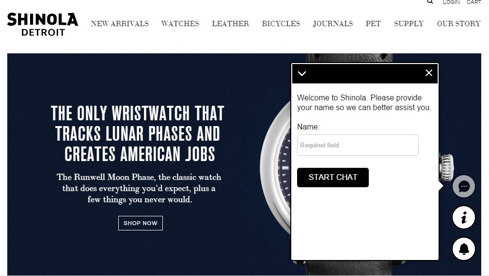 The Moxie suite has added numerous features to Shinola’s online offering, including live chat, an FAQ Knowledge Base and email. The suite is represented by a bell icon that consumers can click on at any time while on the site. The live chat option in particular is designed to reassure consumers that a customer service employee is there to solve any issues in the same way that an in-store employee could do.