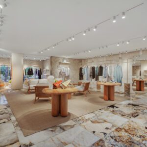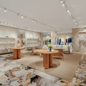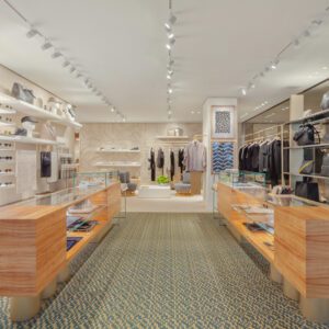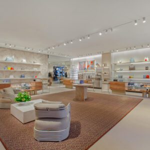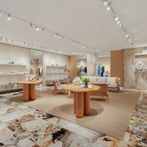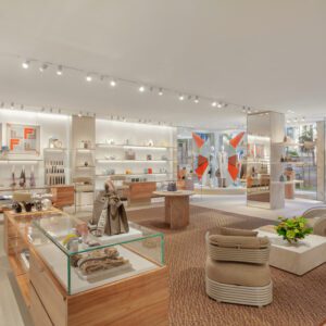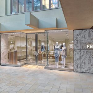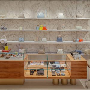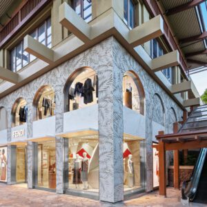 Fendi has relocated and upgraded its boutique at the Royal Hawaiian Center in Honolulu. The 3,186-square-foot space is designed with thoughtful references to the fashion house’s Italian heritage; for example, the store features a re-creation of the arches at Fendi’s headquarters at Palazzo della Civilità Italiana as well as handmade concrete palm tiles. These traditional elements are complemented by contemporary touches such as travertine shelves.