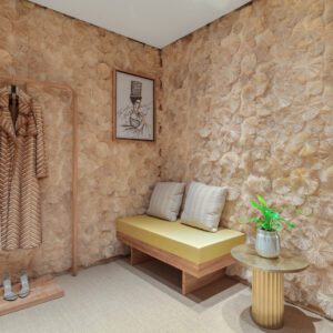 A special client room is hidden by natural texturized sliding doors. The arched space is bright thanks to natural light and designed with luxury details such as Patagonia marble and champagne metal.