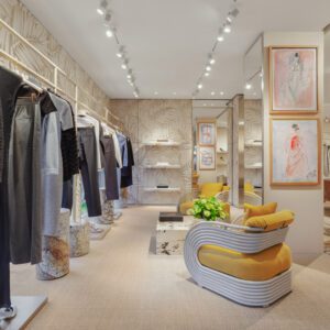 The two-story location features Fendi’s latest ready-to-wear collections, women’s and men’s leather goods, accessories and shoes. The palm tiles extend throughout the space, yet each room has distinct touches. On the first floor, there is a focus wall of women’s bags displayed on travertine shelves.