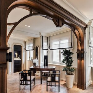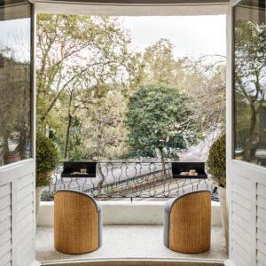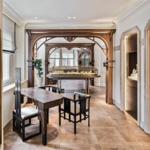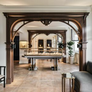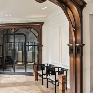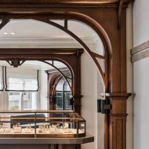 Working closely with Melis Göral, the brand’s eponymous Founder and Creative Director, Sanayi313 Architects conceived an evocative space in harmony with the aesthetic of the jewelry collections on display. The original architectural features of the historic landmark building — along with the space’s double-height ceiling and large windows that naturally connect the interior with the exterior — provided a catalyst for Sanayi313 Architects. The design concept is based on the idea of creating a welcoming salon that incorporates strong Art Deco accents in a thoughtful nod to the jewelry.
