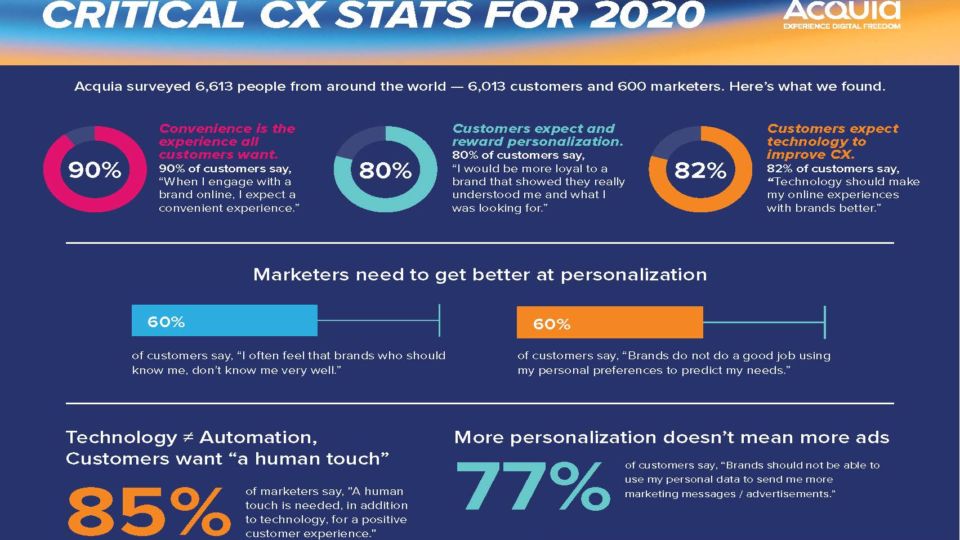 Additionally, this survey of more than 6,000 global consumers reveals how much marketers need to improve their personalization efforts: 60% of shoppers say “I often feel that brands who should know me, don’t know me very well.” The same percentage agree with the statement that “Brands do not do a good job using my personal preferences to predict my needs.” Learn more about how to build a positive CX in this infographic from Acquia.