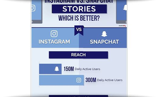 But Snapchat simply can’t match Instagram’s stats: 300 million daily active users vs. Snapchat’s 150 million. Instagram also boasts a 92% brand adoption rate, more than twice the 40% brand adoption rate of Snapchat, according to this infographic from Mediakix.